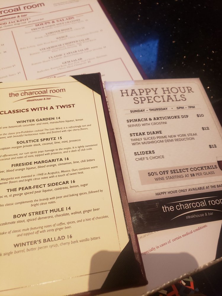 Atmospheric touches, like wine displays and inviting booth seating, create an upscale experience, perfect for any occasion. Whether you're savoring the Chilean Sea Bass or opting for a classic ribeye, The Charcoal Room promises satisfaction and quality craftsmanship in every dish.